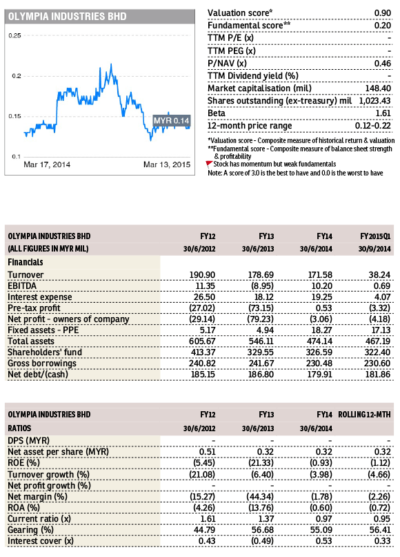 OLYMPIA (Fundamental: 0.2/3, Valuation: 0.9/3) was “Red Flagged” by The Edge Market for its weak fundamentals, suggesting that investors should exercise extra caution.